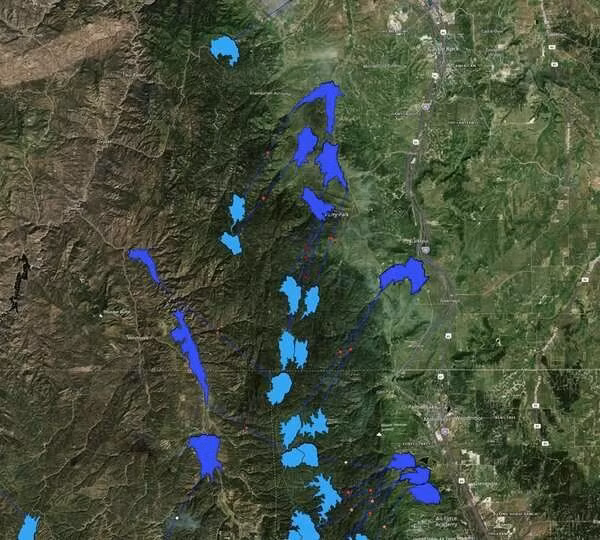 Một bản đồ các hồ chứa ngoài sông có khả năng được ghép nối thành thủy điện được bơm gần Castle Rock, Colorado. Ảnh: Andrew Blakers , CC BY.