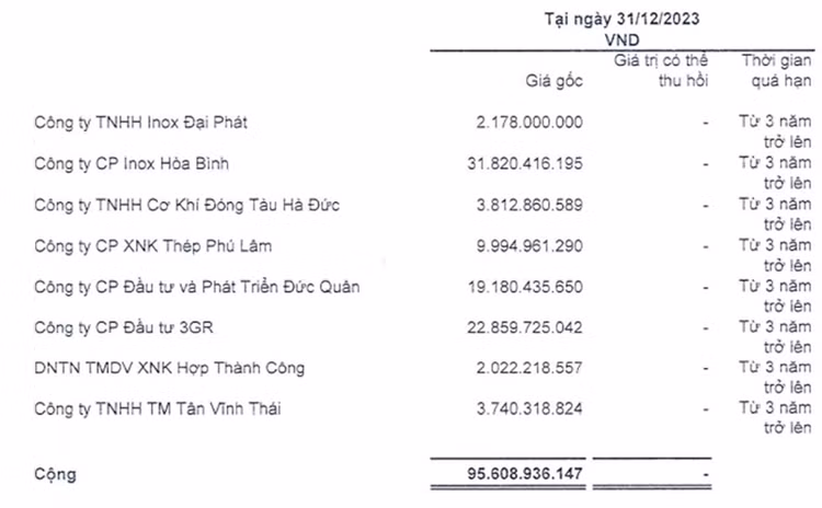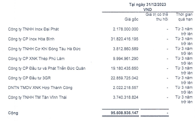Cụ thể, SPD có khoản nợ 31,8 tỷ đồng với Công ty Cổ phần (CTCP) Inox Hòa Bình, 22,8 tỷ đồng với CTCP Đầu tư 3GR, 19,1 tỷ đồng với CTCP Đầu tư và Phát triển Đức Quân, 10 tỷ đồng với CTCP Xuất nhập khẩu Thép Phú Lâm.