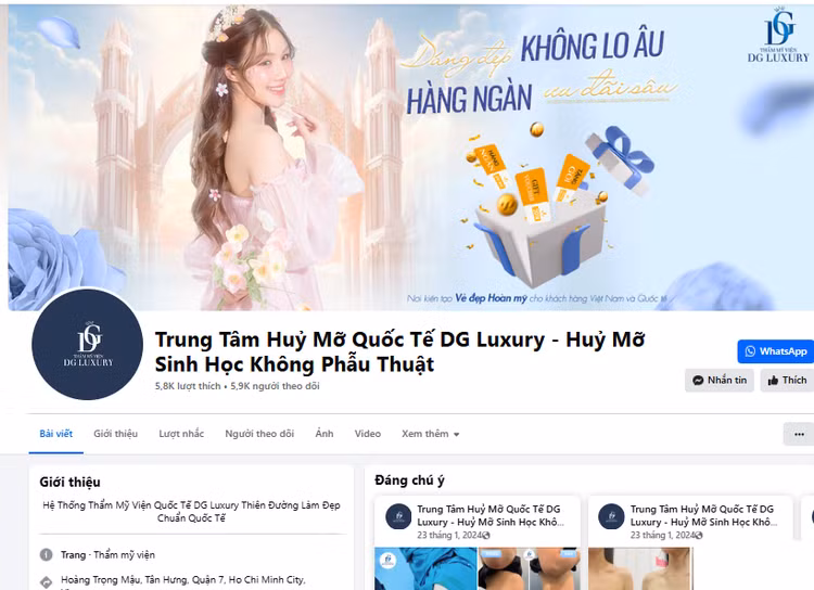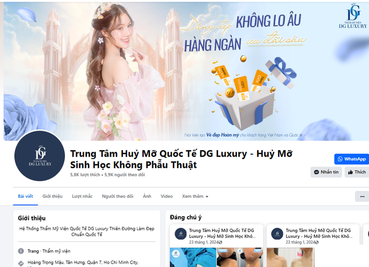 Dù chỉ là hộ kinh doanh, nhưng trước mặt tiền lại treo bảng “Thẩm mỹ viện DG Luruxy”; còn trên mạng Facebook có tên gọi “Trung tâm hủy mỡ quốc tế DG Luxury - Hủy mỡ sinh học không phẫu thuật” đăng tải nội dung quảng cáo dịch vụ làm đẹp như “hủy mỡ, tân trang vóc dáng… không phẫu thuật, đội ngũ bác sĩ giỏi chuyên môn… để dẫn dắt, lừa dối khách hàng nhằm mục đích vụ lợi, tiềm ẩn nguy cơ ảnh hưởng đến sức khỏe của người sử dụng dịch vụ.