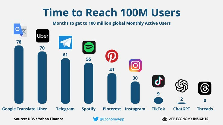 Ứng dụng đứng sau Threads từng mất đến 30 tháng để có được 100 triệu người dùng. Tính đến tháng 5/2023, nền tảng Instagram đang có khoảng 1,63 tỷ người dùng.