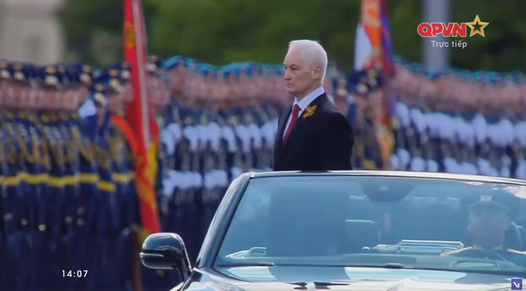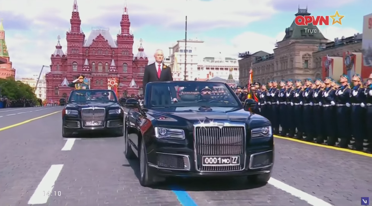 Bộ trưởng Quốc phòng Nga Belousov mang âu phục duyệt đội hình danh dự trên xe chỉ huy Aurus Senat mui trần mang biển số 0001.MO77 chào các khối duyệt binh.