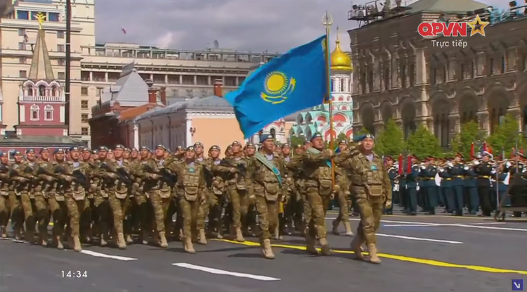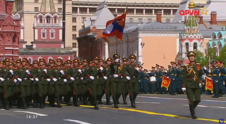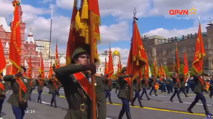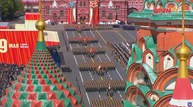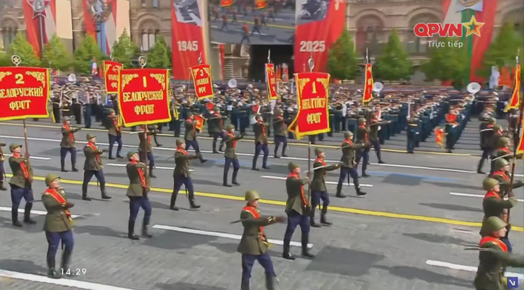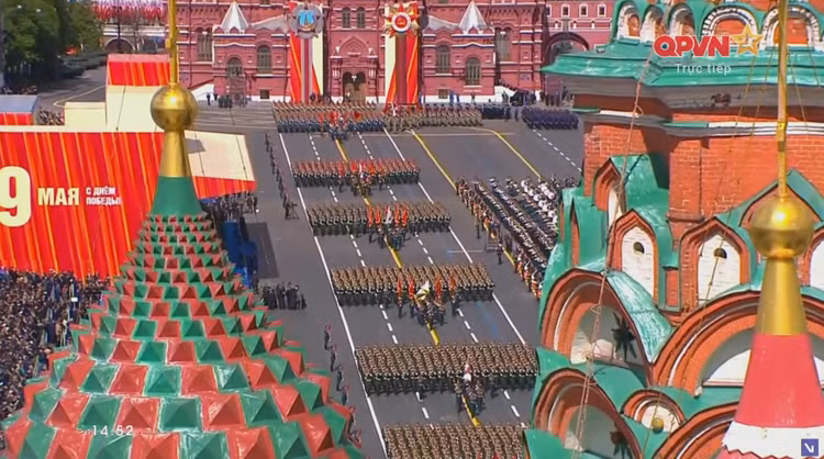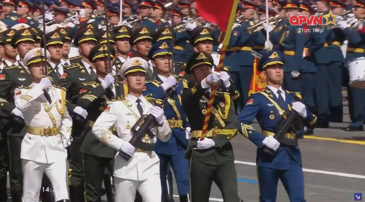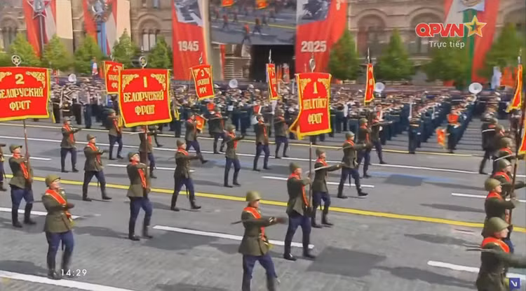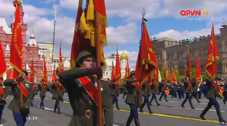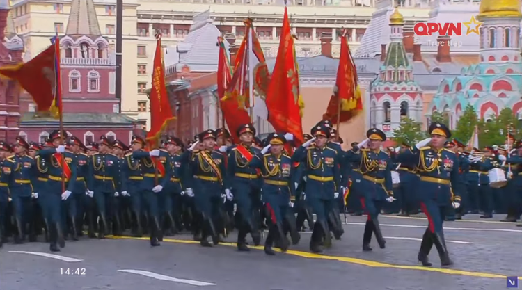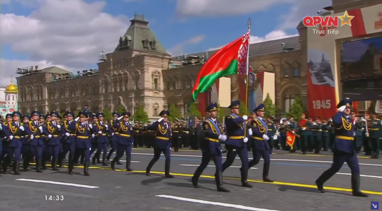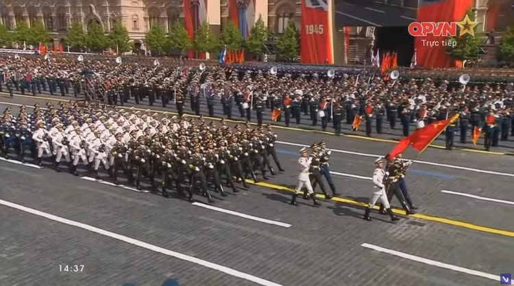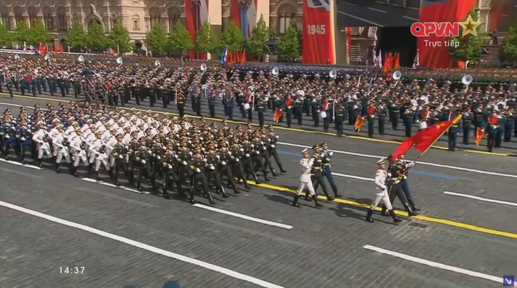 14h34: Các khối quân đội nước ngoài tiến qua lễ đài. Sau đội hình đại diện Hồng quân Liên Xô, các khối đại diện quân đội 13 nước bắt đầu diễn qua lễ đài.