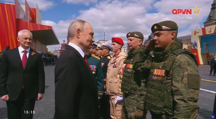 Sau khi duyệt đội hình, Bộ trưởng Quốc phòng Belousov báo cáo với Tổng thống Putin các khối tham gia duyệt binh đã sẵn sàng.