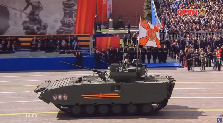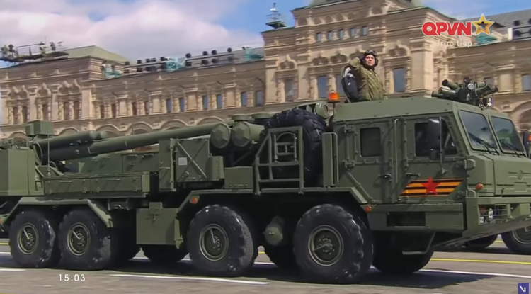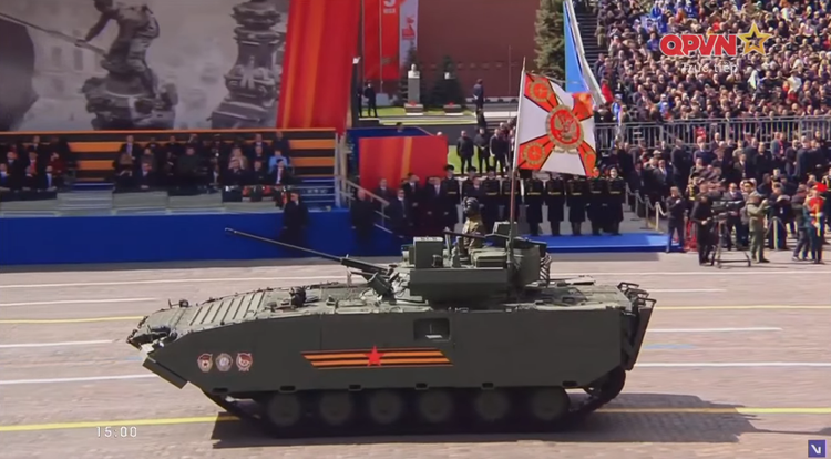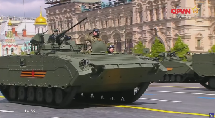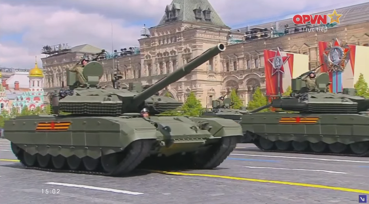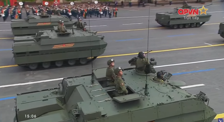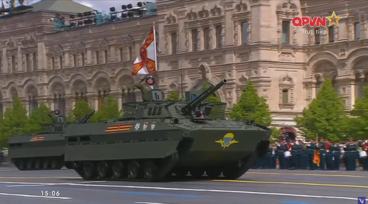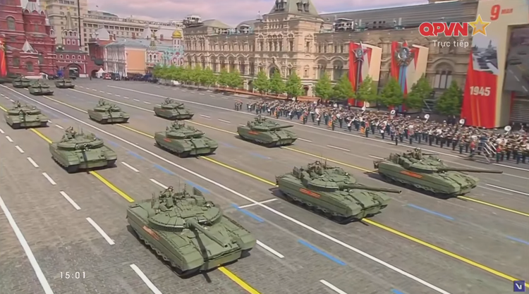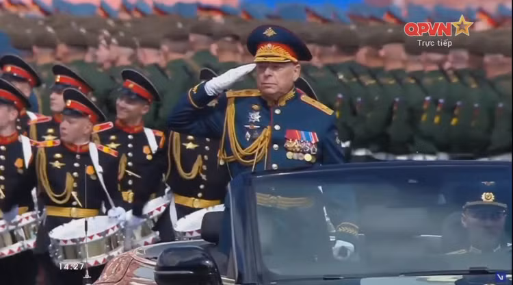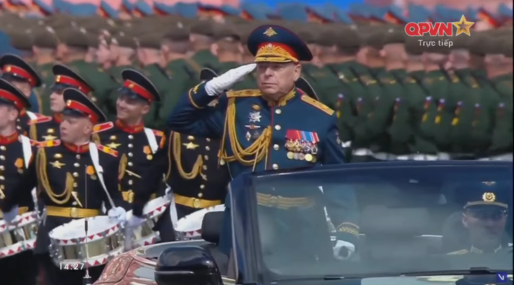 14h27: Chỉ huy duyệt binh năm nay là Tướng Oleg Salyukov. Đi đầu đội hình duyệt binh là xe của tướng Salyukov.