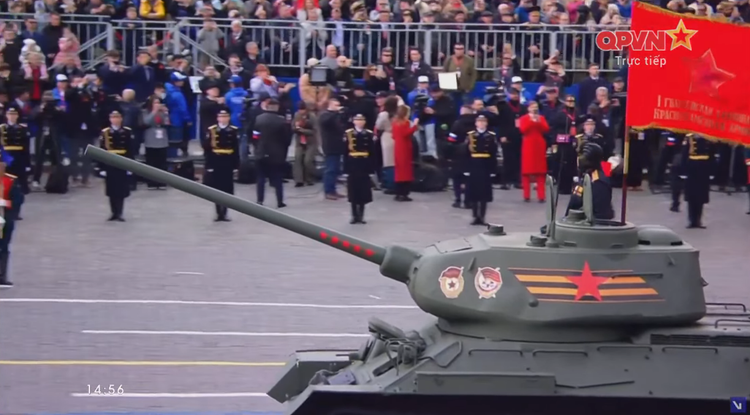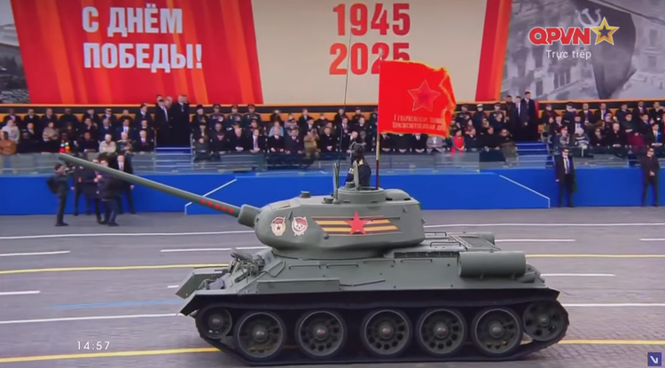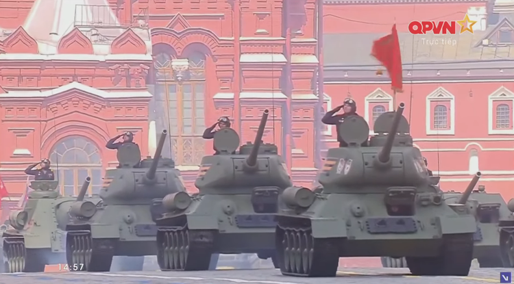 14h57: Bắt đầu duyệt binh của các khối cơ giới. Dẫn đầu là xe tăng T-34/85 huyền thoại.