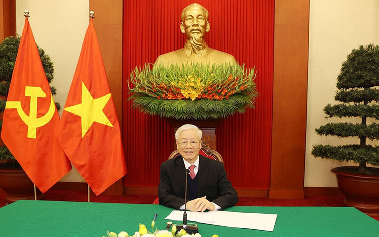Trong cuộc điện đàm, Tổng Bí thư, Chủ tịch nước Nguyễn Phú Trọng cảm ơn Ðảng Dân chủ Tự do Nhật Bản đã gửi điện chúc mừng đến Ðại hội đại biểu toàn quốc lần thứ XIII của Ðảng Cộng sản Việt Nam; cảm ơn Chủ tịch Ðảng Dân chủ Tự do, Thủ tướng Nhật Bản Xư-ga Y-ô-si-hi-đê đã gửi điện chúc mừng tới cá nhân Tổng Bí thư, Chủ tịch nước Nguyễn Phú Trọng; nhấn mạnh Ðại hội lần thứ XIII là sự kiện chính trị trọng đại của Ðảng, Nhà nước và nhân dân Việt Nam, đã thành công hết sức tốt đẹp. Ðại hội đã đề ra phương hướng, mục tiêu phát triển cho 5 năm tới và tầm nhìn đến năm 2030, 2045. Việt Nam kiên trì đường lối đối ngoại độc lập, tự chủ, hòa bình, hữu nghị, hợp tác và phát triển, đa dạng hóa, đa phương hóa quan hệ đối ngoại; chủ động và tích cực hội nhập quốc tế toàn diện, sâu rộng; là đối tác tin cậy và là thành viên tích cực, có trách nhiệm trong cộng đồng quốc tế.