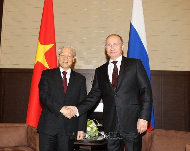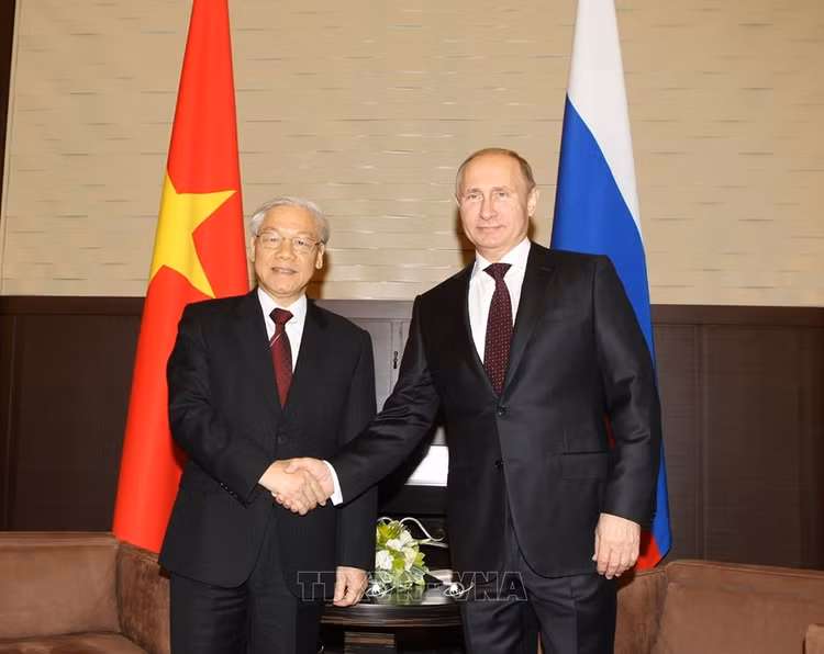 Tổng thống Liên bang Nga Vladimir Putin đón Tổng Bí thư Nguyễn Phú Trọng trong chuyến thăm chính thức Nga năm 2014. Ảnh: Trí Dũng/TTXVN.