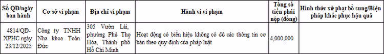 Công ty TNHH Nha khoa Toàn Đức (địa chỉ 305 Vườn Lài, phường Phú Thọ Hòa, TP HCM) bị Sở Y tế TP HCM xử phạt 4 triệu đồng theo Quyết định số 4814/QĐ-XPHC ngày 23/12/2025, do hoạt động có biển hiệu không có đủ các thông tin cơ bản theo quy định của pháp luật.