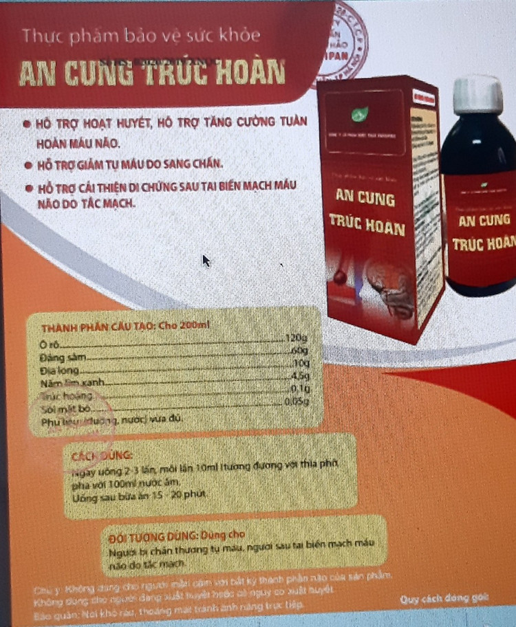 Trang https://ancungtruchoan.info/san-pham/cung-truc-hoan quảng cáo: “Sở dĩ An Cung Trúc Hoàn có thể phòng chống tai biến và điều trị di chứng tai biến thực sự hiệu quả là vì trong An Cung Trúc Hoàn có chứa chất acid cholic, ester phosphoric, nguyên tố vi lượng của sỏi mật bò là nhóm hoạt chất chính có tác dụng mạnh lên mạch não. Chất alpha-asaron trong Ôrô kích thích hoạt động của tế bào não…”.