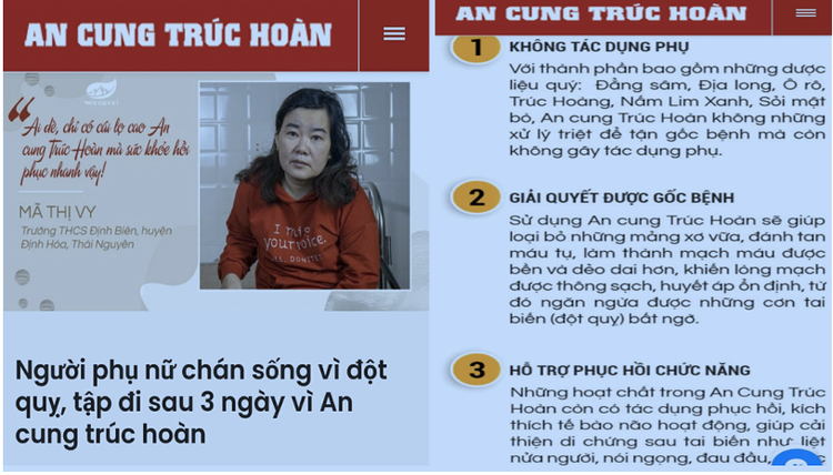 Khảo sát thực tế của PV cho thấy, hiện các trang mạng quảng cáo TPBVSK An Cung Trúc Hoàn là “thuốc” điều trị chữa tai biến mạch máu não, đột quỵ... với đủ cách truyền thông giới thiệu sản phẩm, từ bài viết đến video người bệnh, người nhà bệnh nhân ca ngợi sản phẩm như thuốc “thần tiên”.