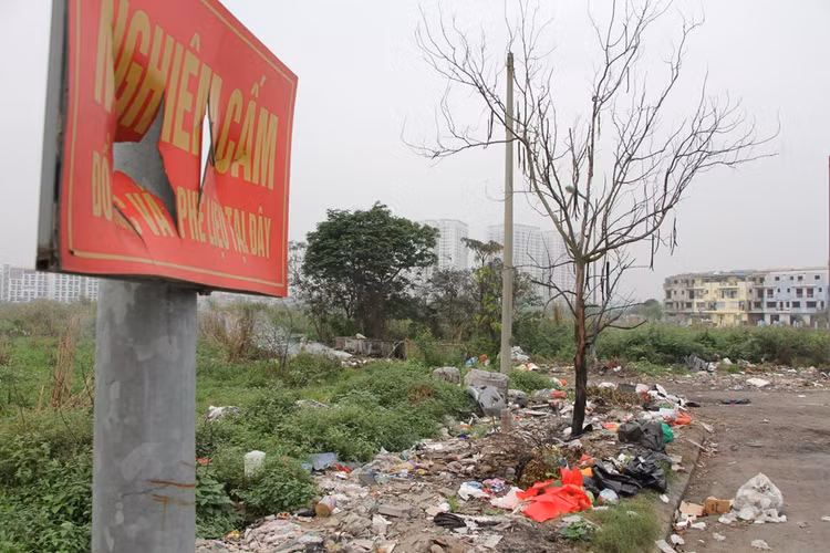 Biển cấm đổ rác và phế liệu tại khu đất trống khu đô thị Vân Canh dường như chỉ “làm cảnh”. Rác thải công nghiệp, vật liệu xây dựng cũng được đổ trộm tại khu đất trống.