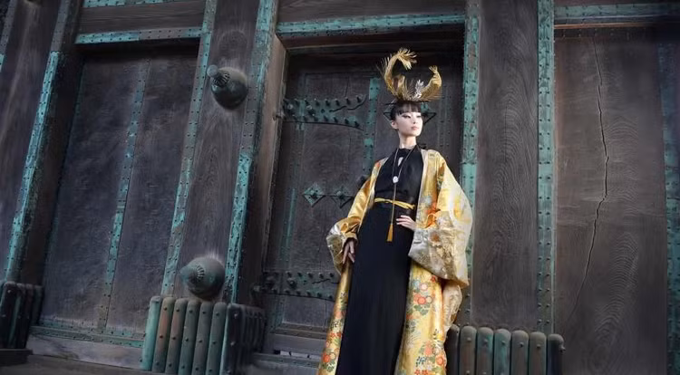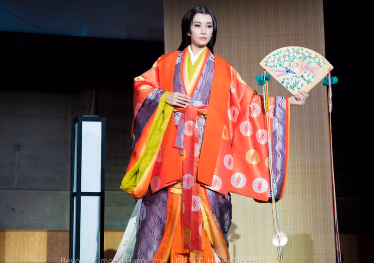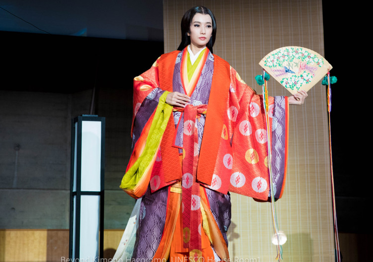 Trình diễn lễ phục junihitoe của nhà thiết kế Kobayashi Eiko tại trụ sở của UNESCO tại Paris năm 2018 (nguồn: Be-Japon)