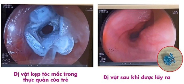 Tại bệnh viện, sau khi thăm khám và chẩn đoán, các bác sĩ xác định dị vật mắc kẹt trong thực quản. Bệnh nhi được nội soi bằng ống cứng, chiếc kẹp tóc đã được lấy ra an toàn mà không gây tổn thương thực quản.