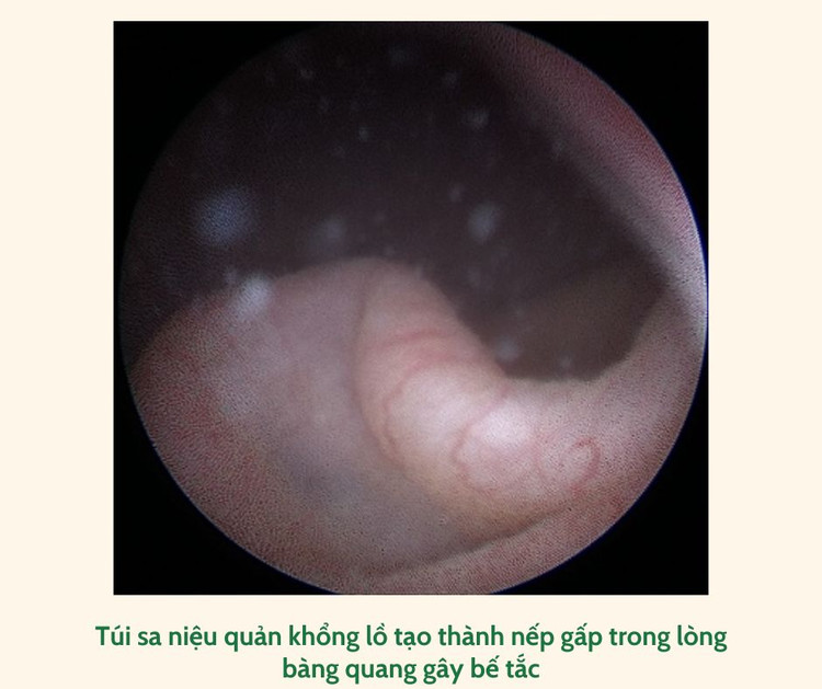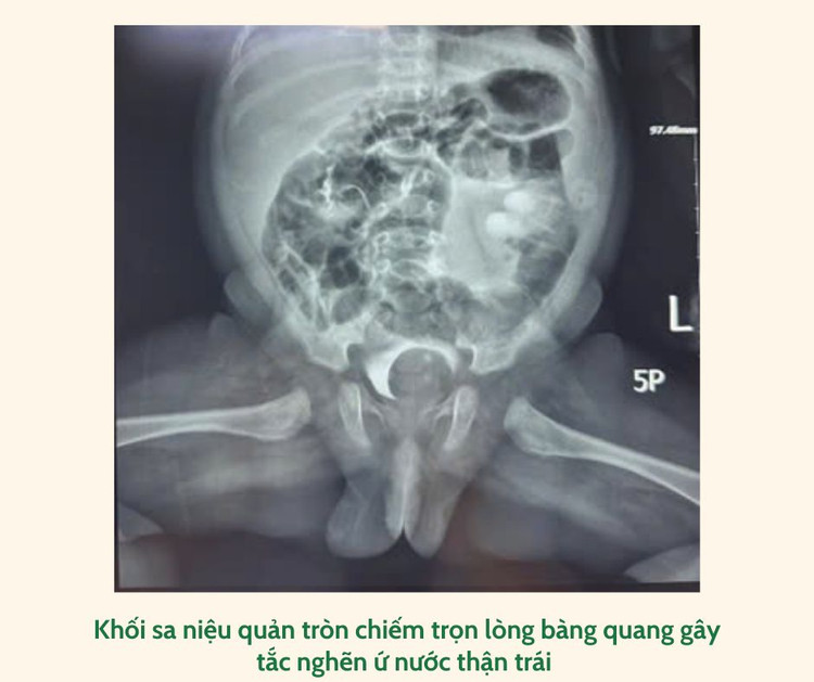 Tại Bệnh viện Nhi đồng 2, bé được các bác sĩ hồi sức và điều trị tích cực. Bệnh nhi được thăm khám tầm soát phát hiện dị tật bẩm sinh hệ tiết niệu, thận niệu quản đôi gây ứ nước thận, đặc biệt bé có khối sa niệu quản khổng lồ chiếm gần trọn trong lòng bàng quang.