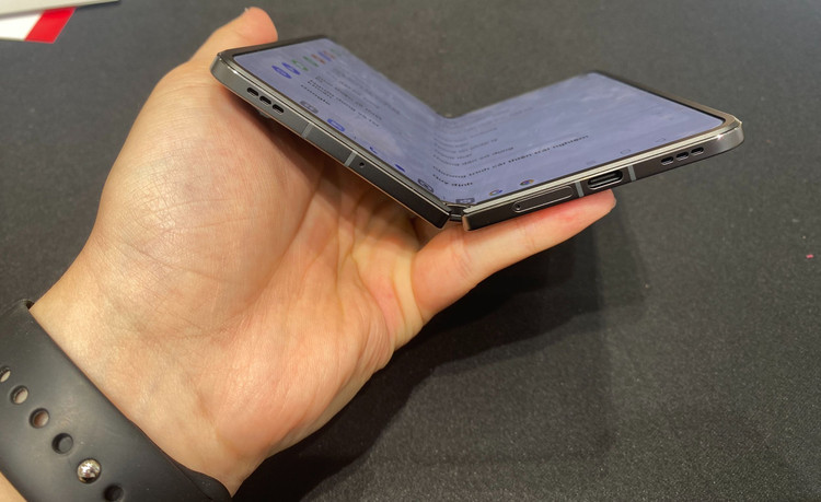 Điều phải đánh đổi là bản lề của máy sẽ không quá vững chãi như Galaxy Z Fold5. Máy chỉ có thể giữ vững góc độ gập ở khoảng 110~120 độ, khi mở quá góc này thì bản lề sẽ tự bung ra.
