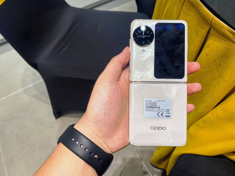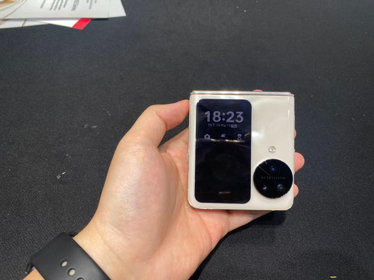 Đi đến phần mặt lưng của Find N3 Flip thì điểm nhấn của thiết bị chính là phần màn hình phụ. Có thể thấy cụm camera của em nó đã có sự thay đổi, không còn là hai camera riêng biệt nữa mà tất cả đều bỏ vào cụm hình tròn khá to với sự xuất hiện của logo Hasselblad càng làm thiết bị thêm ấn tượng.
