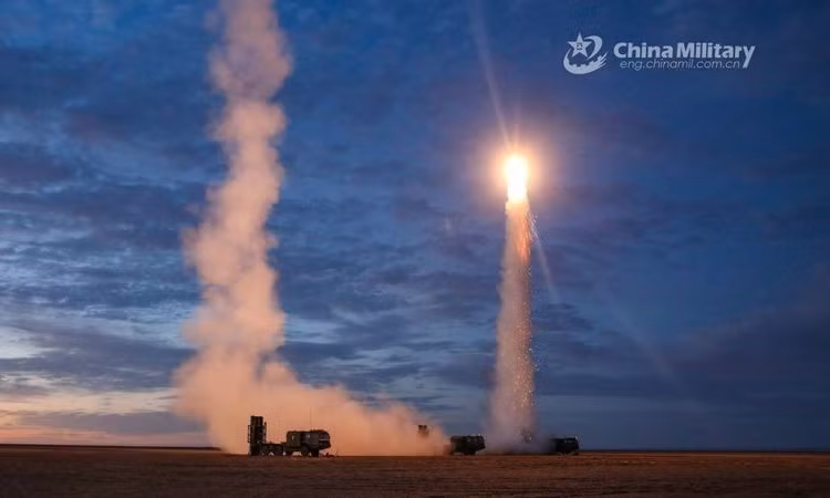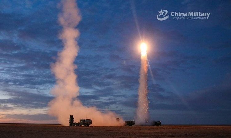 Hệ thống tên lửa phòng không tầm trung thuộc tiểu đoàn tên lửa lữ đoàn phòng không Tập đoàn quân số 72 của PLA bắn một tên lửa đánh chặn trong cuộc diễn tập ở sa mạc Gobi, tây bắc Trung Quốc. Ảnh: China Military.