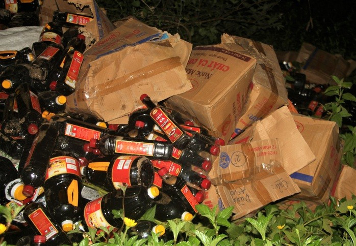Hơn 1000 chai nước mắm không rõ nguồn gốc bị vứt bỏ tại Quảng Nam/Ảnh NLĐ.
