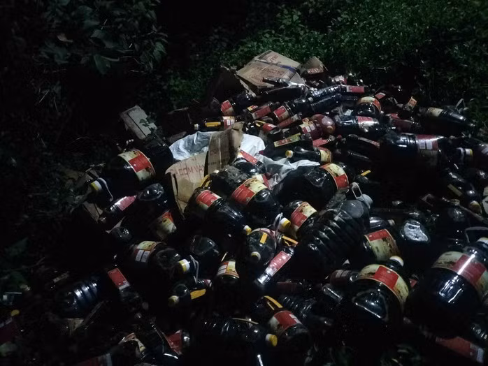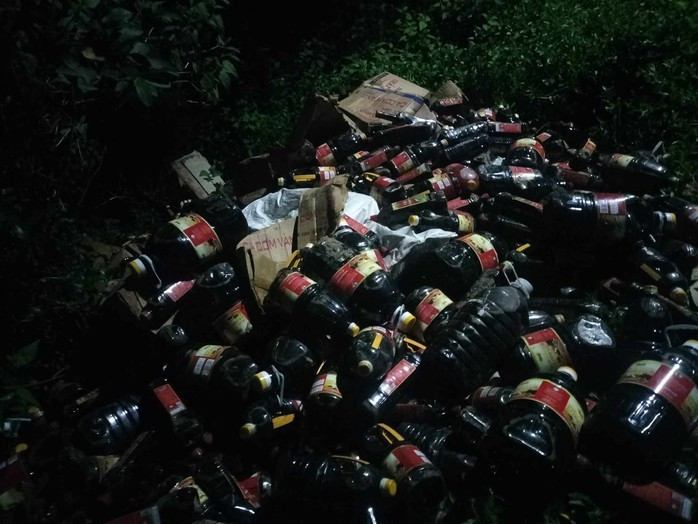 Tại hiện trường, cơ quan chức năng ghi nhận khoảng 1.000 chai loại 1 lít, 5 lít bị đổ bỏ trong bụi rậm bên đường.