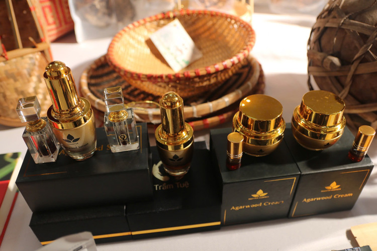 | TS Lê Thị Hồng Gấm và các sản phẩm từ trầm hương tại Triển lãm “Rừng và Biến đổi khí hậu” do Trường ĐHKHTN phối hợp Tây Ban Nha tổ chức. Ảnh: Mai Loan. |
