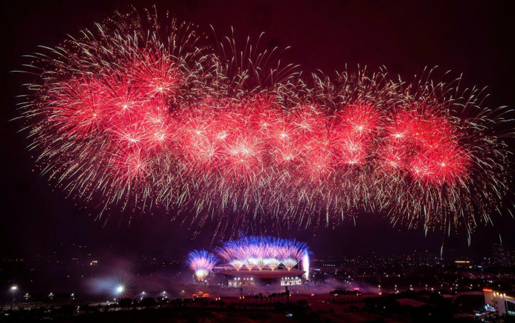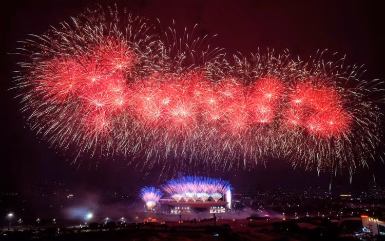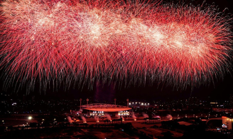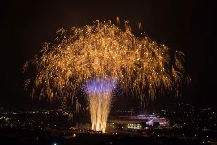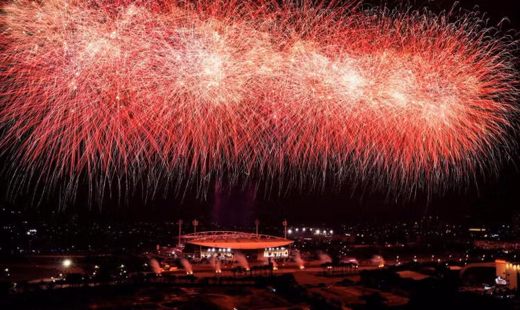 Ở những cao trào của chương trình, hàng nghìn quả pháo hoa tầm cao đồng loạt khai hỏa, kết hợp hệ thống giàn phun hỏa thuật trên mái và hai cánh khán đài, đẩy cảm xúc khán giả lên đỉnh điểm. Cuối chương trình, bầu trời Mỹ Đình rực sáng với màn pháo hoa tổng lực, đa sắc màu, được lập trình chính xác đến từng phần nghìn giây, tạo nên khoảnh khắc thị giác mãn nhãn và đầy xúc cảm.