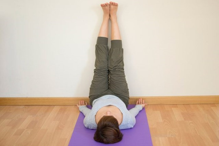 Nằm trên giường và gác chân lên cao, dựa vào tường. Hai cánh tay thả lỏng ở hai bên người, lòng bàn tay hướng lên trên. Hít thở nhẹ nhàng.
