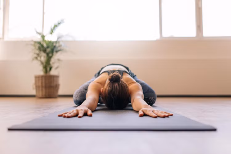 Đây là một động tác đơn giản giúp giải tỏa căng thẳng, đồng thời giúp người tập cảm thấy thoải mái hơn khi đi ngủ. Để thực hiện tư thế này, bạn hãy quỳ trên sàn, đầu gối dang rộng bằng hông và ngồi trên gót chân. Sau đó, bạn gập người về phía trước để đặt thân mình vào giữa hai đùi, duỗi hai tay về phía trước hoặc dọc theo cơ thể, trán tựa thoải mái trên sàn.