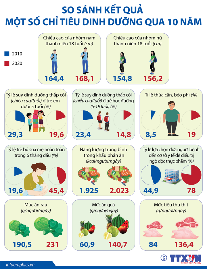 Nhiều chỉ tiêu dinh dưỡng năm 2020 đã có sự thay đổi đáng kể so với 10 năm trước – theo kết quả Tổng Điều tra Dinh dưỡng toàn quốc 2019-2020 do Viện Dinh dưỡng quốc gia, Bộ Y tế công bố. Cụ thể: