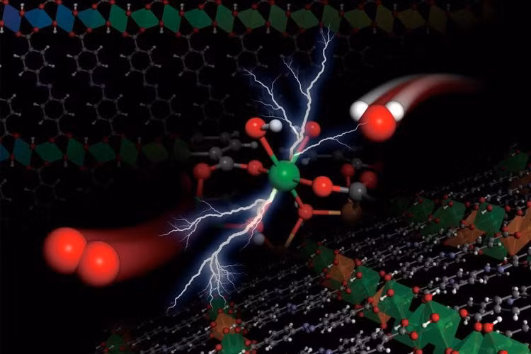 Phản ứng điện hóa, tách các phân tử nước thành các phân tử oxy trong cấu trúc của khung hữu cơ hydroxit kim loại thuộc mạng tinh thể trên và dưới.