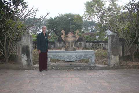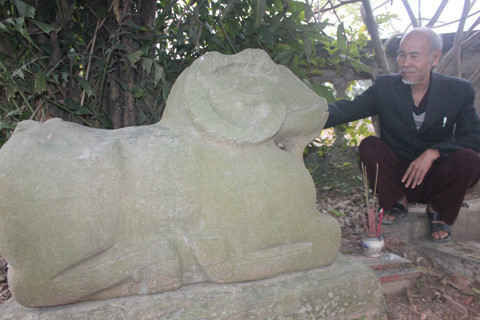 Ông Hoè và tượng con cừu Ấn Độ còn lại ở mộ Sĩ Nhiếp.