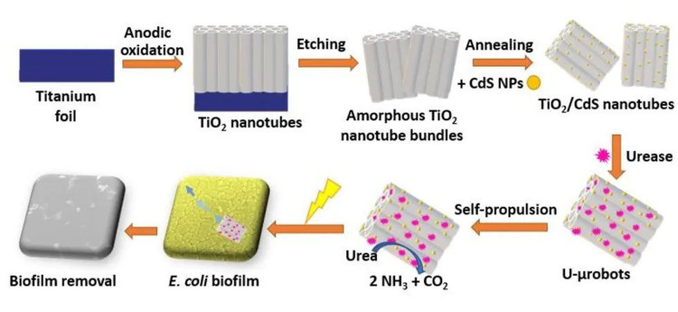 TiO 2 là chất xúc tác quang chuẩn, có độ ổn định quang học và hóa học cao, không độc hại, chi phí thấp và tính oxy hóa mạnh. Ghép TiO 2 với các vật liệu phản ứng với ánh sáng như CdS là một phương pháp đơn giản để tạo ra các vi robot, được kích hoạt chống vi khuẩn dưới ánh sáng nhìn thấy. Khi tiếp xúc với ánh sáng, các bó ống nano TiO 2 / CdS tạo ra các gốc phản ứng gây hiệu ứng quang độc trên màng sinh học.
