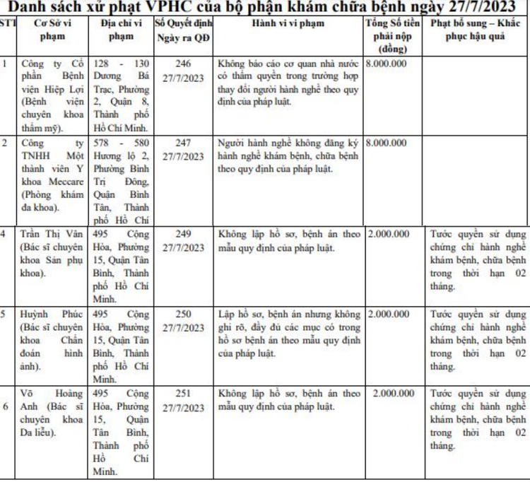 Ngoài ra, trong danh sách xử phạt của Thanh tra Sở Y tế TP HCM về vi phạm hành chính trong lĩnh vực y tế còn có 2 tổ chức và 3 cá nhân.