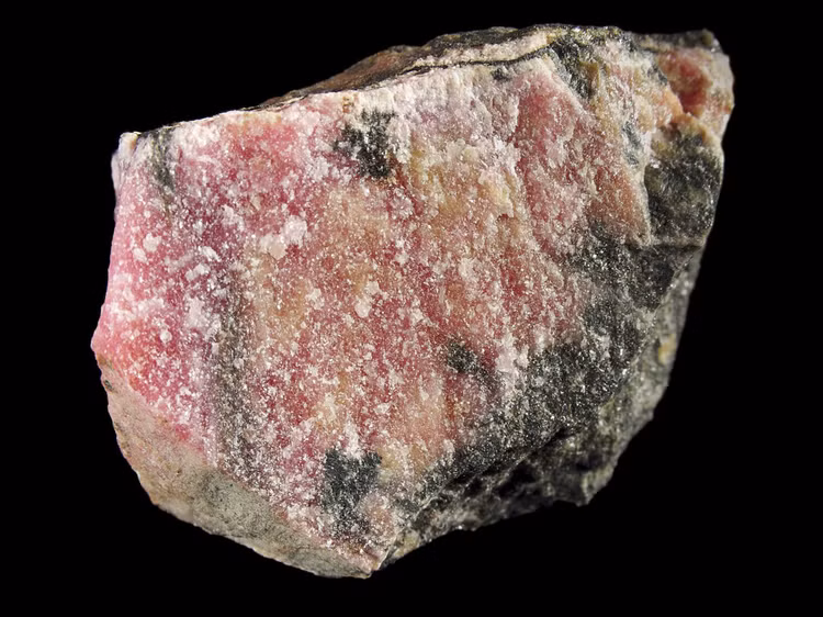 Rhodonite là một khoáng vật silicat mangan nổi bật với gam màu hồng đến đỏ hồng, thường được điểm xuyết bởi những đường vân đen như nét mực vẽ. Chính sự tương phản này tạo nên vẻ đẹp độc đáo, khiến rhodonite dễ dàng được nhận ra giữa vô số loại đá quý khác. Tên gọi của nó bắt nguồn từ tiếng Hy Lạp “rhodon”, nghĩa là “hoa hồng”, gợi lên sắc màu đặc trưng đầy quyến rũ.
