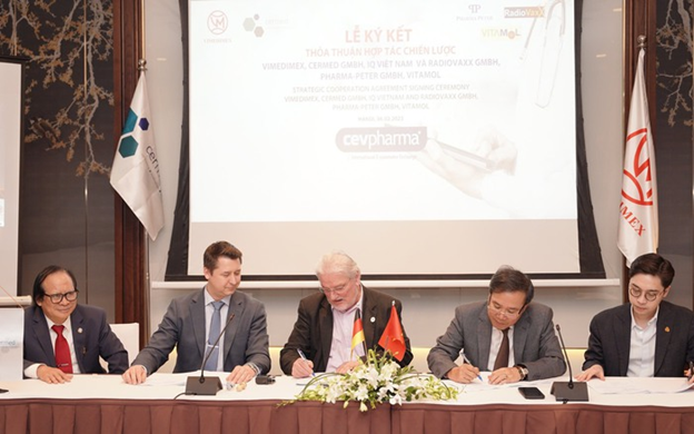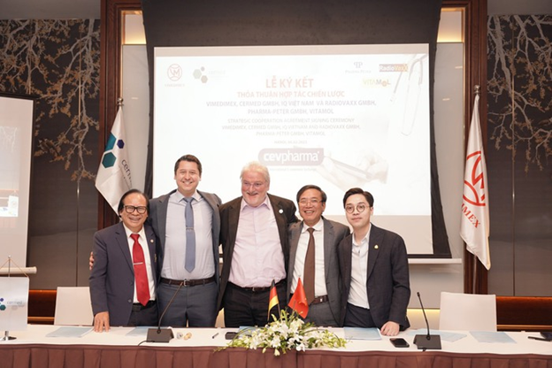 Thứ nhất: Với sự phát triển ngày càng nhiều dược chất phóng xạ phù hợp cho các ứng dụng chẩn đoán và điều trị theranostics, việc sử dụng dược chất phóng xạ mới đã trở nên rộng rãi trên thế giới và đang được đẩy mạnh ứng dụng trong lâm sàng tại Việt Nam. Chính vì vậy, Vimedimex, Cermed GmbH cùng với Công ty RadioVaxx GmbH, Wiesbaden Ký kết Hợp tác liên danh với Công ty Eczacibasi Monrol (Eczacıbaşı-Monrol) của Thổ Nhĩ với mục tiêu sản xuất, bào chế: (1) Dược chất phóng xạ điều trị thụ thể Pepti và kháng nguyên màng đặc hiệu tuyến tiền liệt PSMA kết hợp với các hạt nhân phóng xạ phát tia β (Lu-177, Y-90) hoặc các hạt nhân phát tia α (Ac-225, Bi-213) trong điều trị bệnh lý u thần kinh nội tiết với 177Lu-Dotatate và điều trị bệnh lý ung thư tiền liệt tuyến di căn; (2) Dược chất phóng xạ ghi hình phỏng đoán Ge68/Ga68 là một đồng vị phóng xạ có nhiều ứng dụng mới tiềm năng, đặc biệt trong việc đánh dấu phóng xạ, nhằm ghi hình chẩn đoán xác định giai đoạn bệnh, theo dõi đáp ứng sau điều trị của các bệnh lý ung thư thần kinh nội tiết, ung thư tuyến tiền liệt…