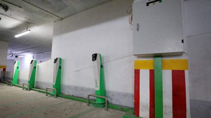 Các trụ sạc xe điện lắp đặt tại tầng hầm một khu chung cư tại Hà Nội.