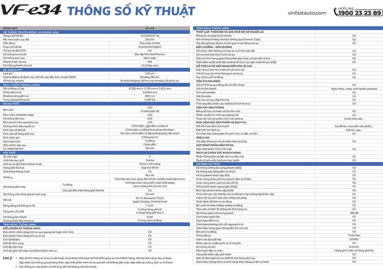 Như vậy, sau 10 tháng công bố, VinFast đã chính thức cho ra mắt mẫu ô tô điện đầu tiên tại thị trường Việt Nam. VF e34 là mẫu SUV thuộc phân khúc C, trang bị động cơ điện có công suất tối đa 110kW, mô-men xoắn cực đại 242Nm. Xe sử dụng bộ pin dung lượng 42kWh, có thể đi được quãng đường khoảng 285km sau mỗi lần sạc đầy và có thể tối ưu để đạt mức gần 300km. Ở chế độ sạc nhanh, xe có thể di chuyển khoảng 180km sau khoảng 18 phút sạc.