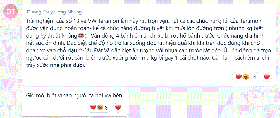 Chị Dương Thụy Hồng Nhung – khách hàng nữ cầm lái Teramont chia sẻ: “Trải nghiệm của tôi về VW Teramon lần này thật sự trọn vẹn. Tất cả các chức năng lái của Teramont được vận dụng hoàn toàn - kể cả chức năng đường tuyết khi mưa lớn đường trơn. Hệ dẫn động 4 bánh hỗ trợ đắc lực cho đến êm ái khi xe bị rớt hố bánh trước. Chức năng địa hình mang đến sức ổn định cho xe. Đặc biệt chế độ hỗ trợ lái xuống dốc rất hiệu quả khi đi trên dốc đứng khi đợi đoàn xe vào chỗ đậu ở Cầu Đất”.