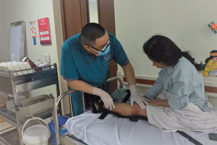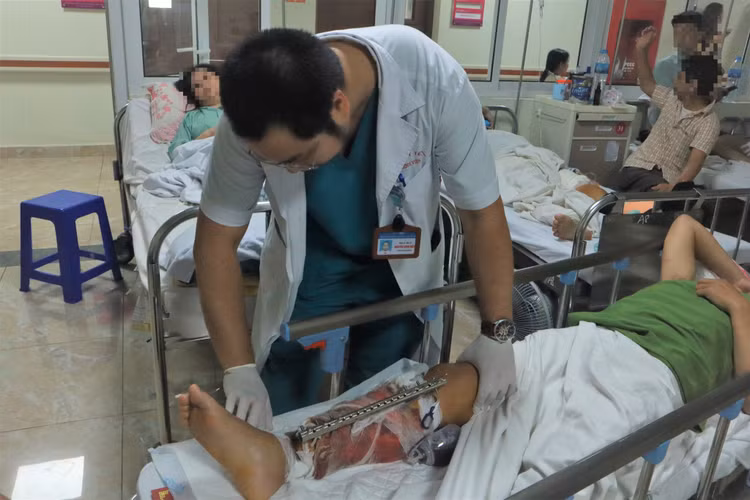 Người bệnh đã được hồi sức chống sốc và các bác sĩ phẫu thuật cố định ngoại vi xương chày, cẳng chân phải, xử lý vết thương phần mềm, chuyển vạt che phủ xương. Các tổn thương khác hiện tại ổn định và theo dõi thêm.