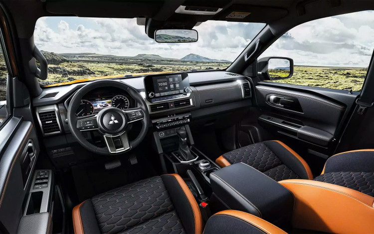 Nhờ sự gia tăng kích thước, không gian bên trong Mitsubishi Triton rộng rãi hơn. Theo công bố, chiều rộng khoang cabin tăng thêm 50 mm. Thiết kế cũng hiện đại hơn với vô lăng 3 chấu mới, phía sau bố trí màn hình đa thông tin 7 inch. Màn hình giải trí trung tâm nay đặt nổi với kích thước 9 inch, thay vì chìm như trước. Các trang bị đáng chú ý khác như ghế bọc da kết hợp da lộn, ghế lái chỉnh điện 8 hướng, điều hòa tự động 2 vùng, có cửa gió hàng ghế thứ hai, đề nổ bằng nút bấm.