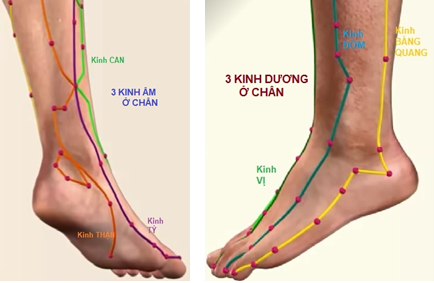Theo châm cứu, mặt trong chân có 3 đường kinh âm là Tỳ, Can và Thận. Mặt ngoài chân liên hệ với 3 đường dương là Vị, Đởm và Bàng quang.