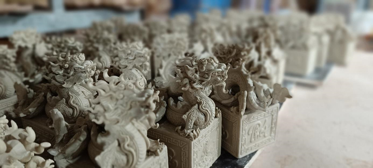 Ngoài ra, theo ông Khoa, sau khi những ấn rồng hoàn thiện phần tạo hình bằng đất sét, phôi sẽ được chuyển đi tráng men và nung trong khoảng 5 ngày trước khi đem đi vẽ, dát vàng.