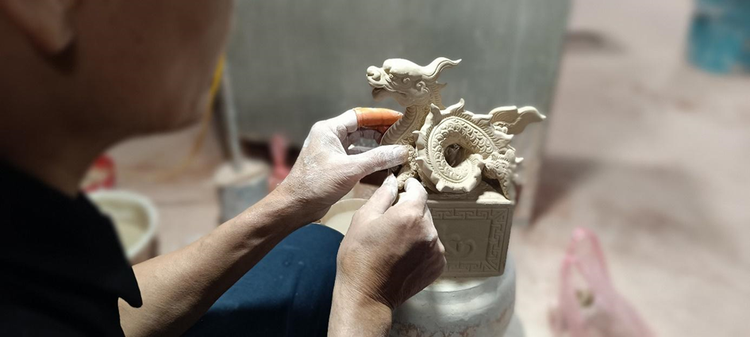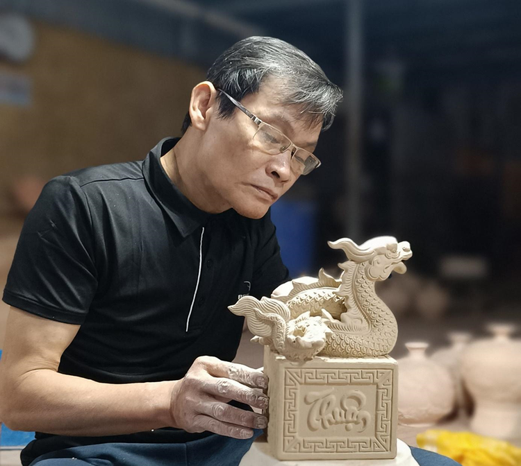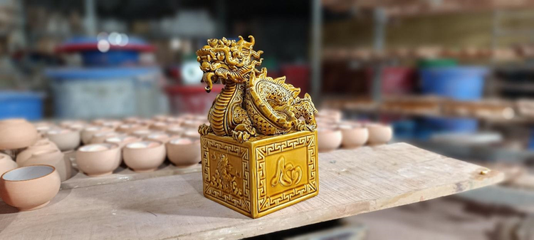 Ông Phạm Việt Khoa, nghệ nhân quá nửa đời gắn với gốm sứ cho biết, mỗi năm xưởng của ông đều được đặt làm linh vật tương ứng của năm đó. Năm nay, xưởng ông được đặt làm chính là ấn rồng dát vàng, được lấy ý tưởng cách điệu theo hình mẫu ấn vàng "Hoàng đế chi bảo" từ thời Vua Minh Mạng. Từ xưa đến nay, hình tượng rồng luôn tượng trưng cho sự uy nghi, thịnh vượng và may mắn.