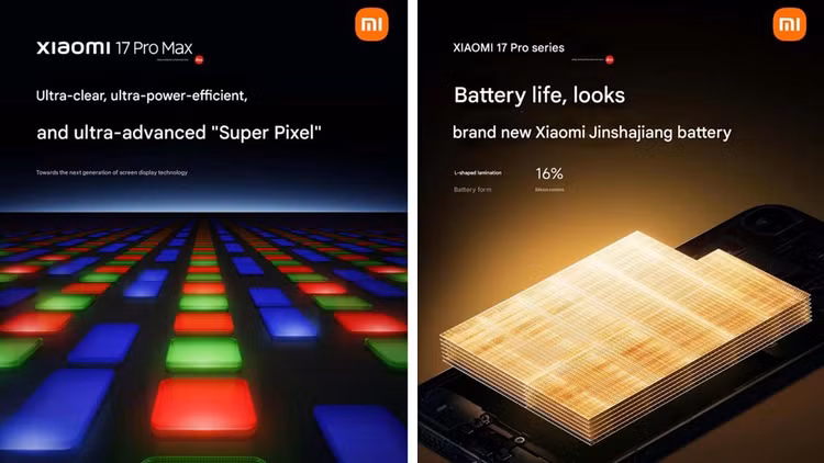 Trong khi đó, Xiaomi 17 Pro Max mang màn hình chính LTPO OLED 6,9 inch 12-bit, cùng màn hình phụ 2,9 inch. Camera giữ nguyên cảm biến chính 50 MP, nhưng ống kính tele periscope sử dụng cảm biến lớn hơn (ISOCELL GN8 1/2") và khẩu độ f/2.6, cho chất lượng cải thiện.