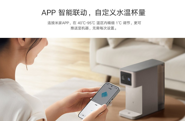 Thiết bị còn hỗ trợ NFC, cho phép người dùng dùng thẻ đi kèm để gắn lên cốc chỉ định để lấy nước theo các cài đặt về dung tích và nhiệt độ đã lập trình sẵn chỉ bằng một lần chạm. Ngoài ra, người dùng có thể điều khiển máy từ xa qua ứng dụng Mijia để theo dõi thời gian thực hoặc điều chỉnh nhiệt độ chính xác từng 1°C.