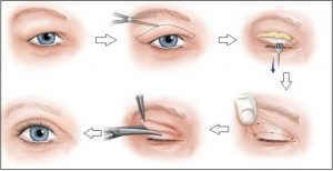Đầu tiên bác sĩ đo vẽ, phác thảo nếp mí mắt mới. Tiếp theo là sát khuẩn, gây tê vùng mí mắt. Bước 3 là tiến hành phẫu thuật chữa sụp mí mắt. Sau khi phẫu thuật bác sĩ sẽ tư vấn cho bệnh nhân cách chăm sóc mắt. Thời gian mỗi cuộc phẫu thuật thực hiện trong khoảng 60-90 phút tùy từng trường hợp. Chi phí dao động 10-15 triệu đồng.