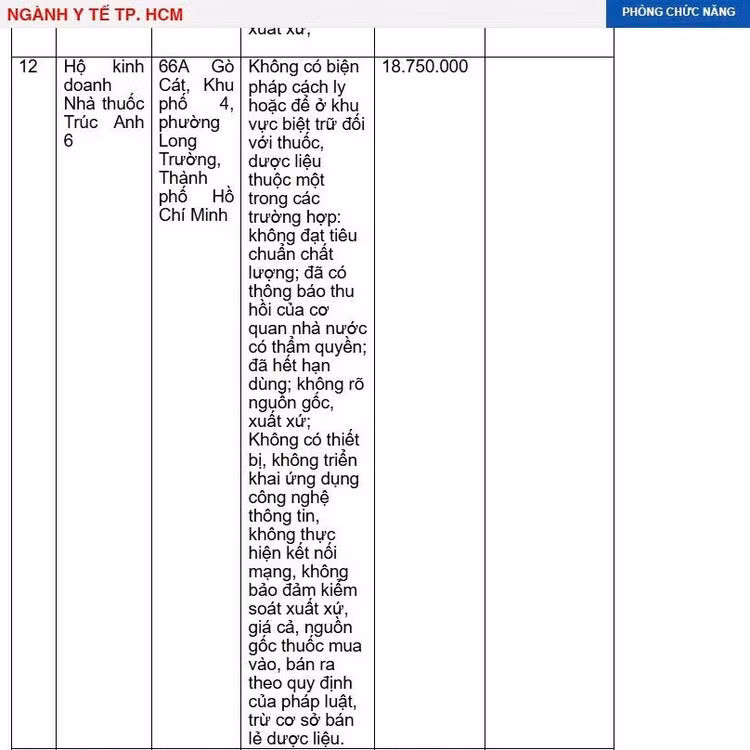 Cùng vi phạm trong lĩnh vực dược, Hộ kinh doanh Nhà thuốc Trúc Anh 6 (66A Gò Cát, Khu phố 4, phường Long Trường, TP HCM) đã bị Sở Y tế TP HCM xử phạt hơn 18,7 triệu đồng.