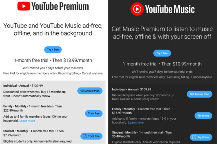 YouTube cũng tăng giá của Music Premium lên 10.99 USD (khoảng 260 nghìn đồng) cho mỗi tháng, từ giá cũ là 9.99 USD (khoảng 236 nghìn đồng). Việc này diễn ra trong bối cảnh Apple và Amazon đã thực hiện những động thái tương tự trong năm qua, YouTube cũng đang siết chặt vấn đề chặn quảng cáo.